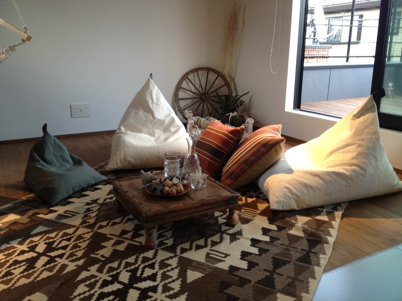 今回のモデルルームには大型の家具は入れず、それ以外には大き目のクッション、あとは植物や小物、ドライフラワーなどのディスプレイで空間を構成。