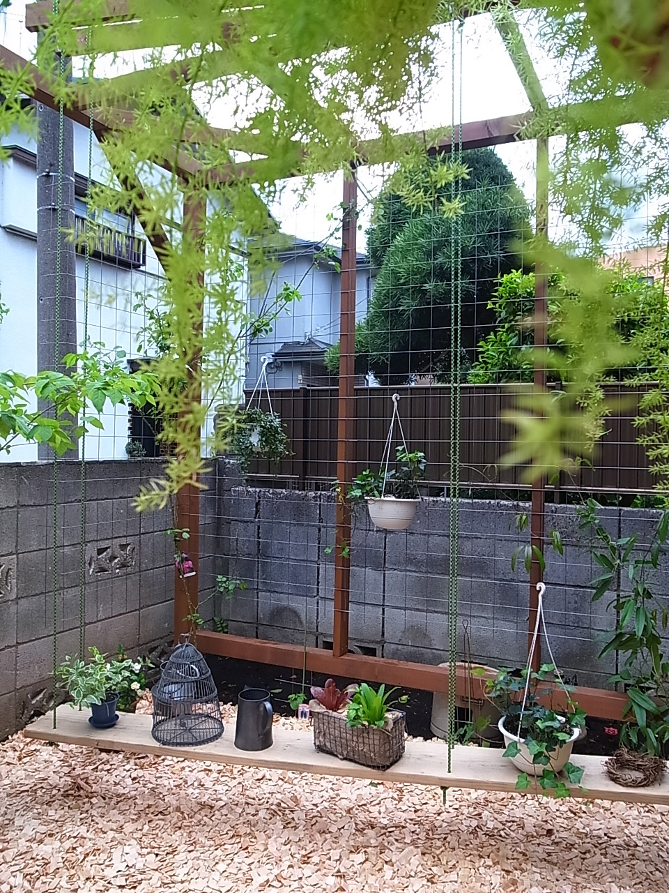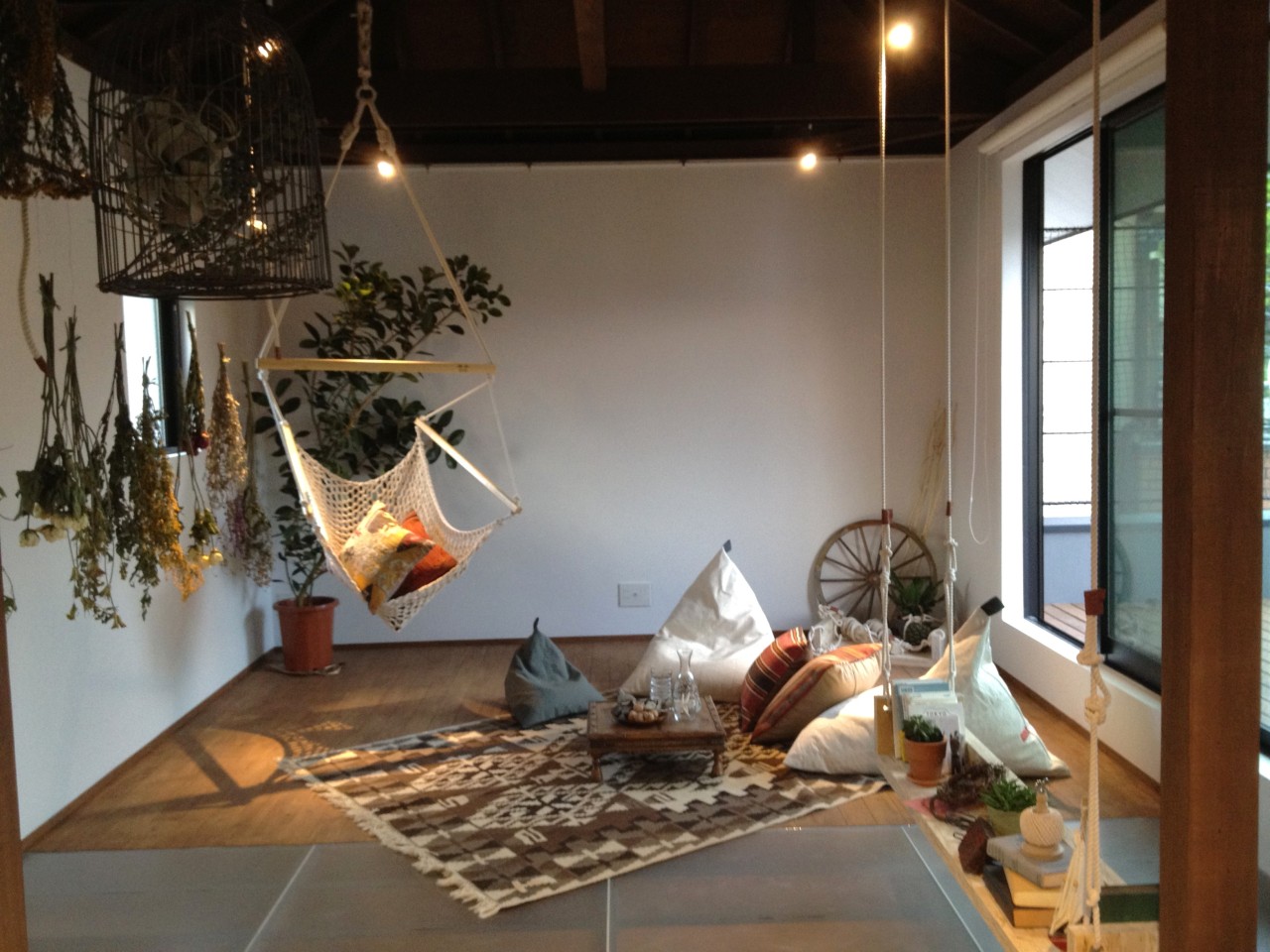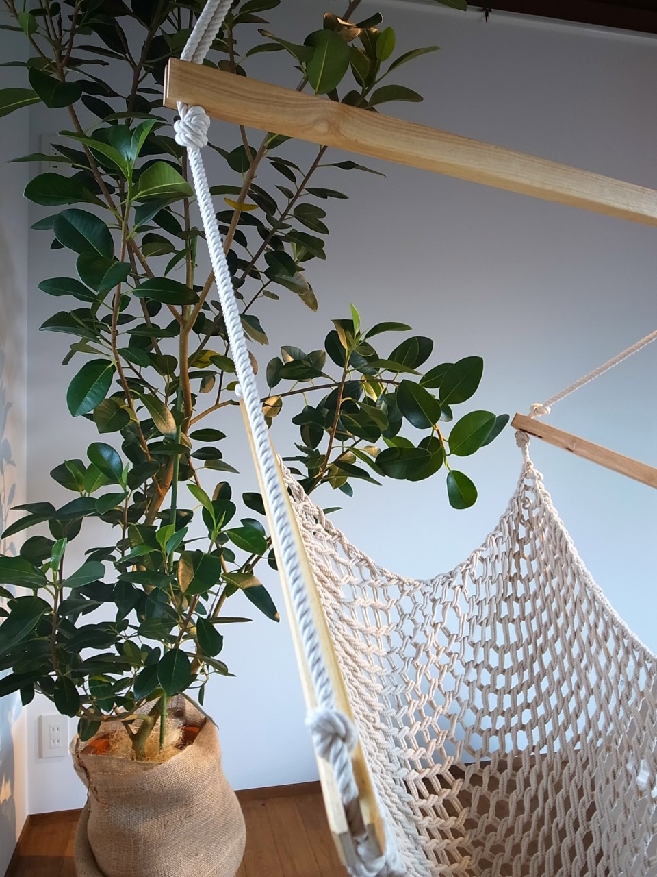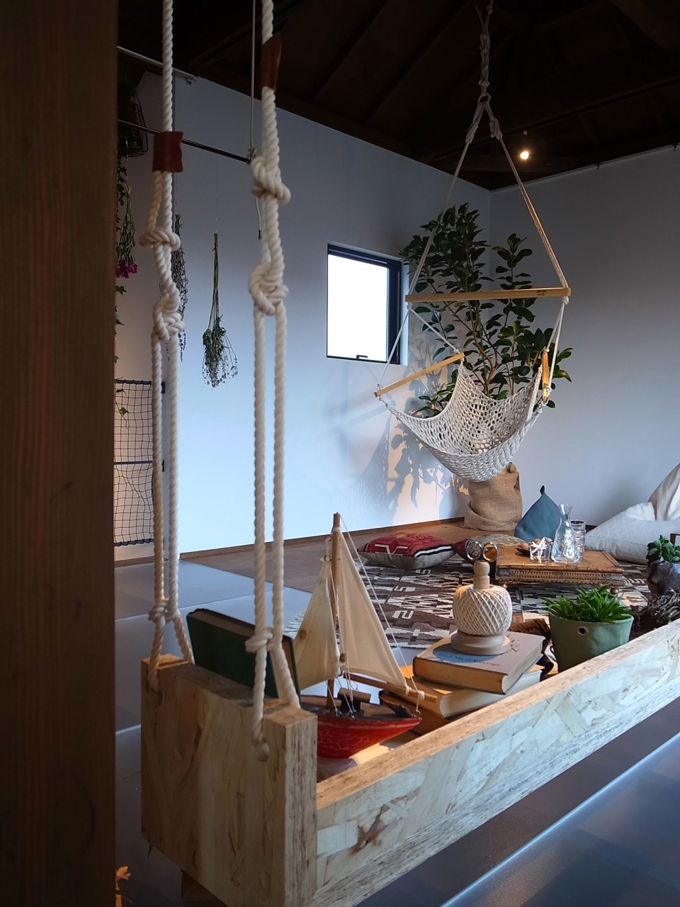 ロープワークで内と外にブランコを作り、バーやハンモックを吊るし、低くなりがちな目線を上げる工夫をしました。