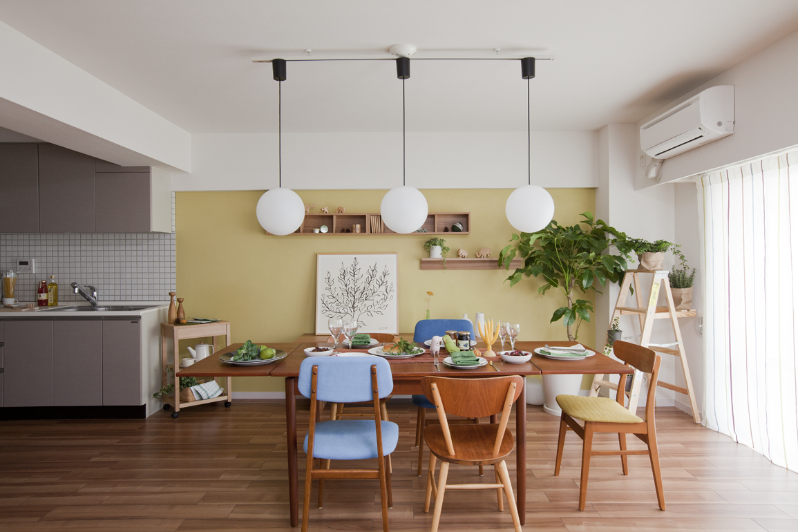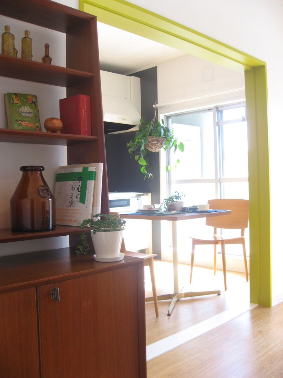 キッチンとリビングを仕切る間仕切りは取り払って枠を黄色く塗装。