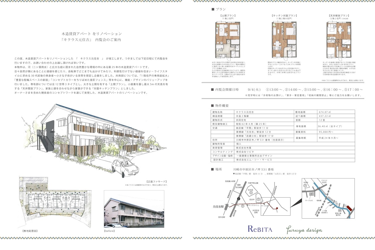 この度、木造賃貸アパートをリノベーションした「キクラス元住吉」が竣工致します。つきましては下記日程にて内覧会を行いますので、お誘い合わせの上、お越し頂ければ幸いです。