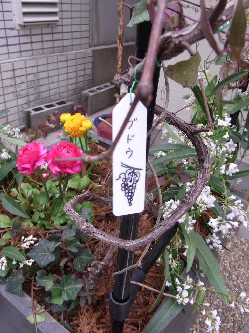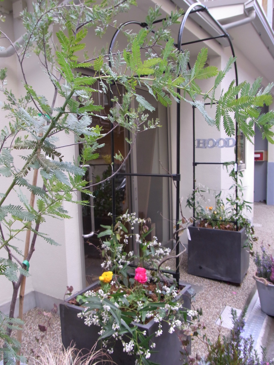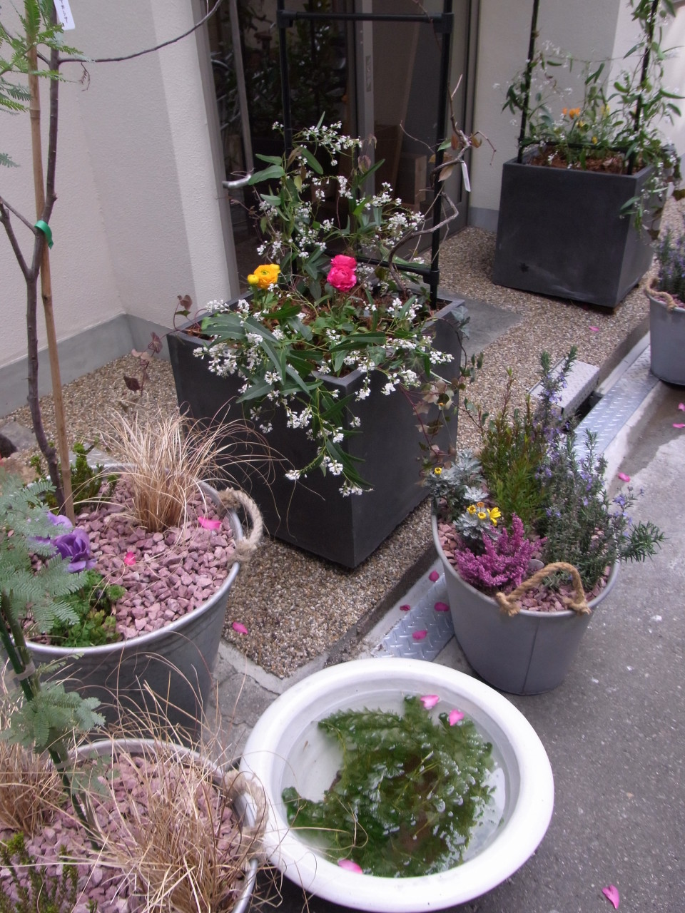 路地裏ということもあり、ブリキなどの個性のある鉢で華やかに演出しました~。