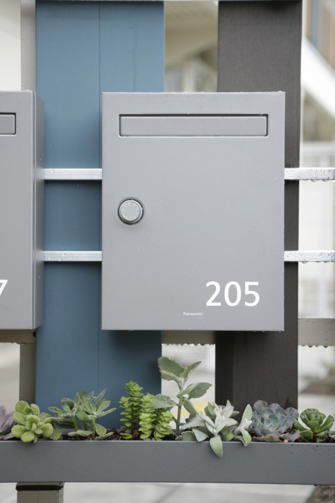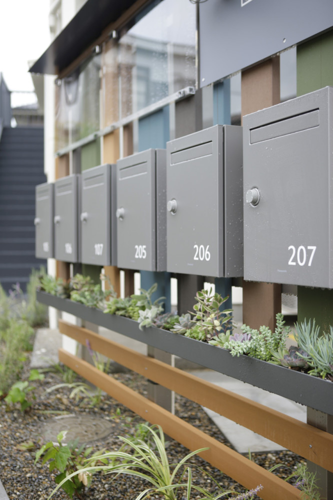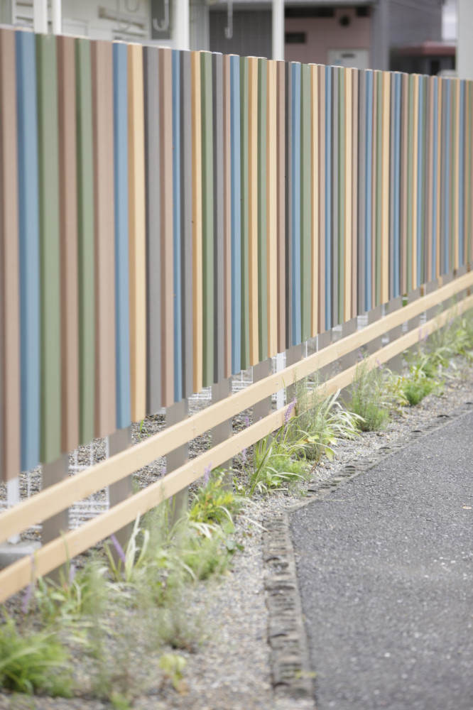 1階住宅の付加価値付けの一つとして、庭空間を付与し、敷地外と区切る大和塀風フェンスには着色を施した。