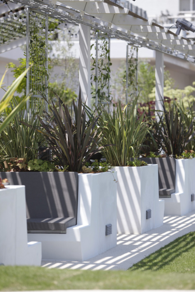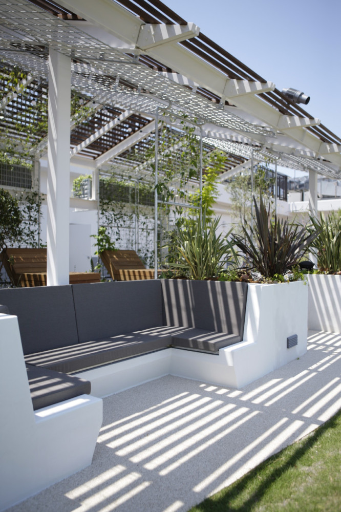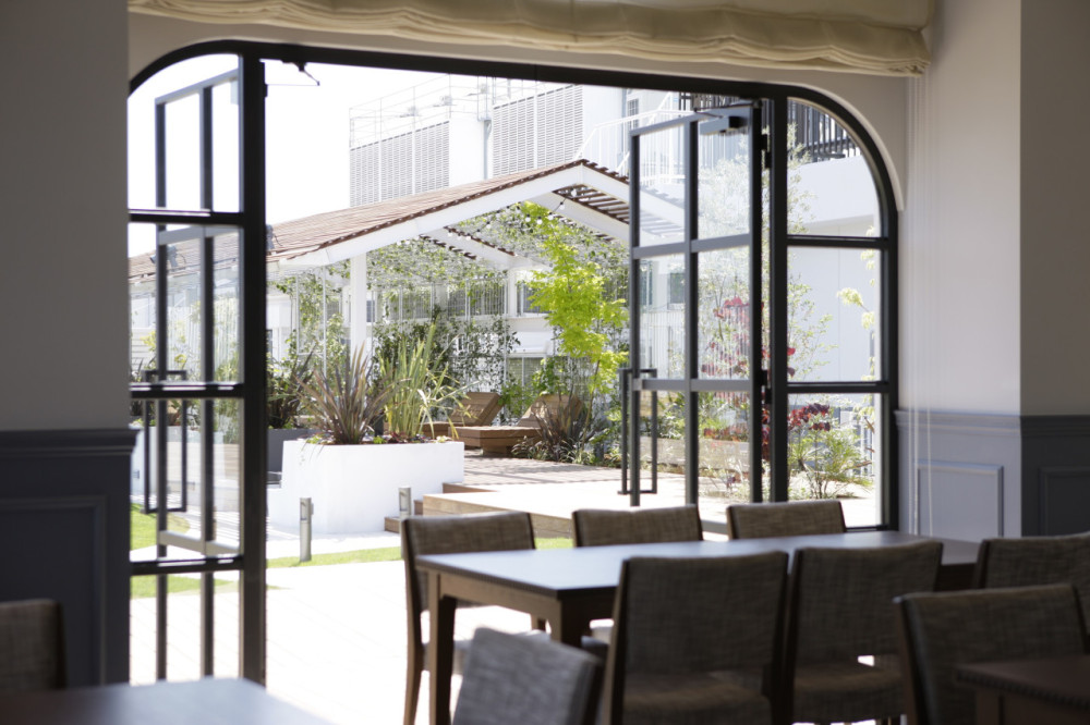 もともとネットが張られたテニスコートとして利用されていた場所が、今回の計画により海風の似合う、緑豊かな屋上庭園と変貌した。