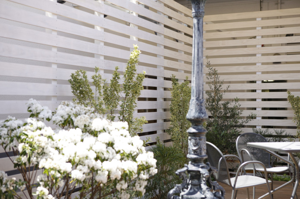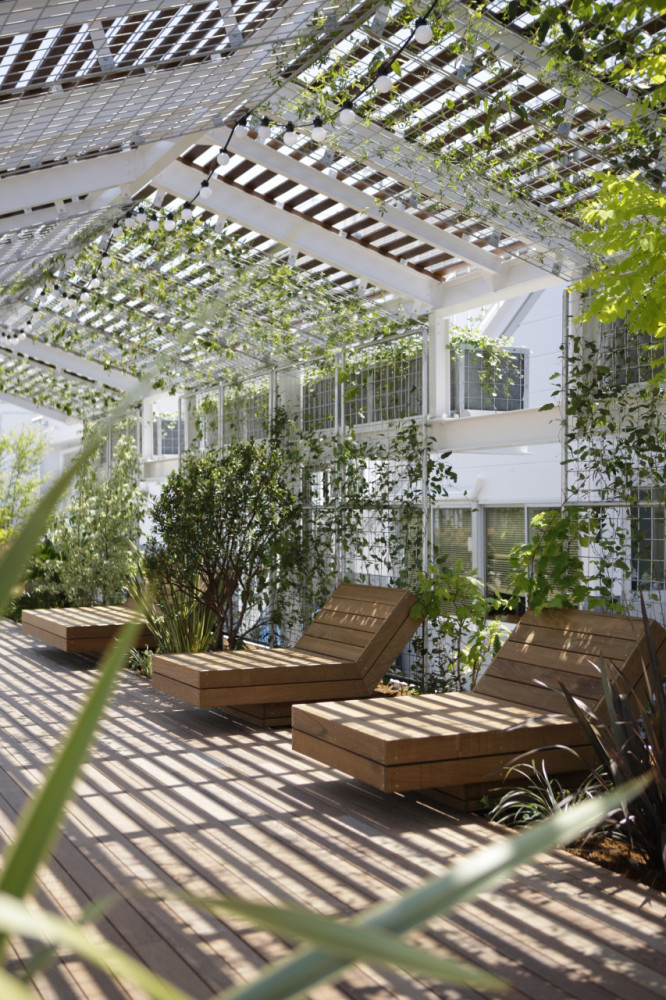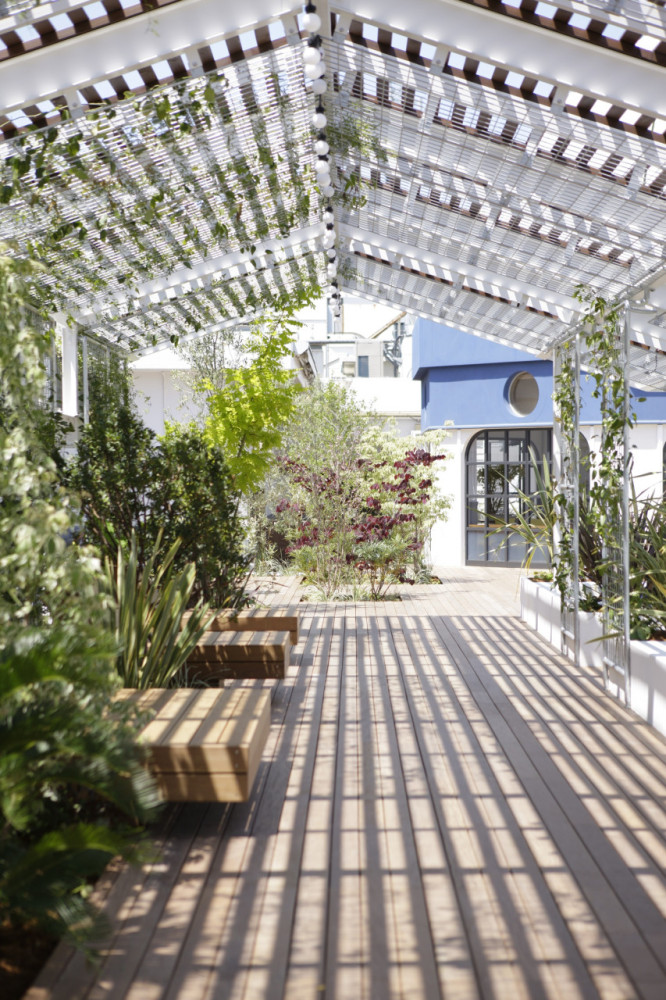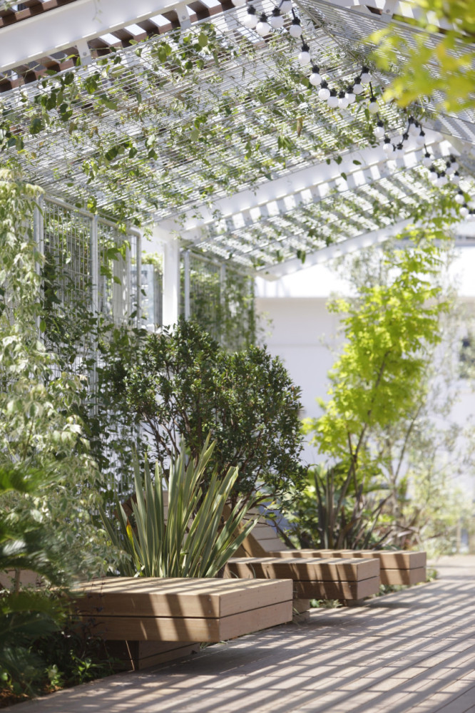 北側と南側は木漏れ日テラスと杜の舞台。北側に設置したパーゴラにより、ベンチでは木漏れ日を感じながら休むことができる。