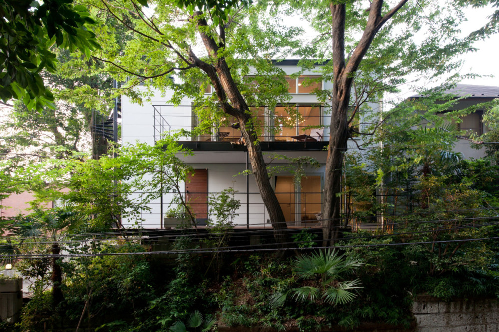 渋谷区代々木。代々木八幡に対面する最大高低差6mの敷地。かつては八幡さんと一体の敷地に切り通しを設けたことが大谷石の擁壁と敷地内の植生から推測される。当初新築案も検討されたが、既存建築が9.3m×7.5mのキューブ状のシンプルな構成であったことや既存植樹保存の観点から、リノベーション案にてプランニングが行われた。オーナーの要望としては、目の前の緑を生かしたプランとしたい。代々木公園を遠望する屋上を設けたい。暖炉を導入したい。傾斜地ならではのランドスケーププランをしてもらいたい。建物性能を向上させたい。といくつかの要望があるなか、一貫していたのはそれぞれの場所、スペース、デザインに機能的にも意匠的にも意味を持たせたいという内容であった。