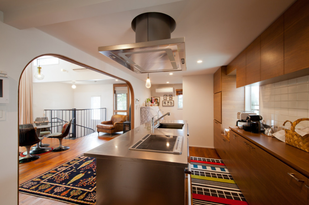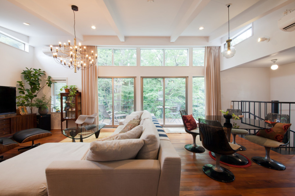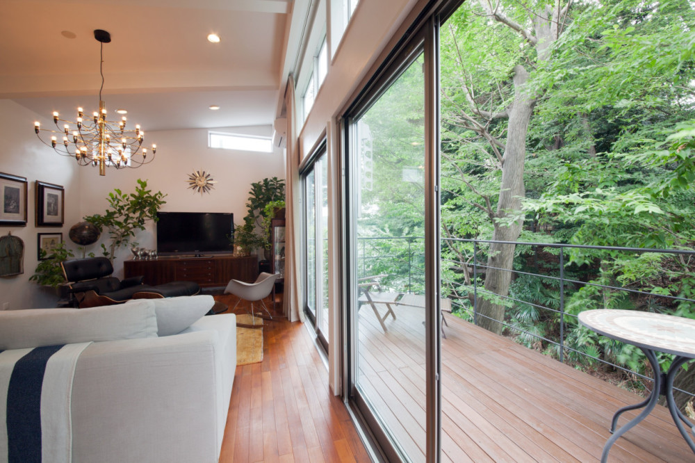 そこで2階リビングダイニングスペースの構造検証を行い既存スペースからの拡張を図り、リビングダイニングのみならずキッチンに至るまで、森に対峙する構成とすることで、大きなテラスからつながるダイナミックな空間を獲得することに成功した。