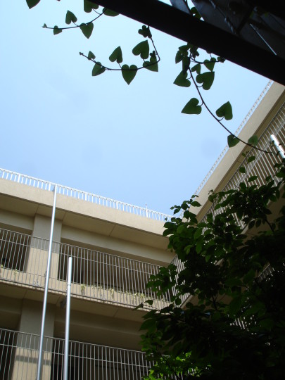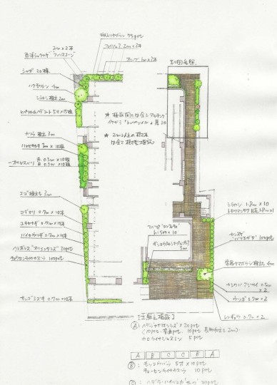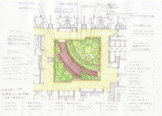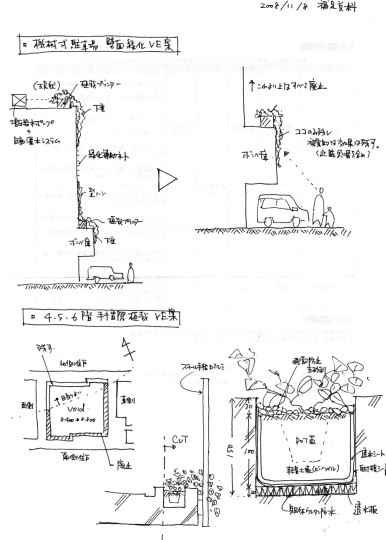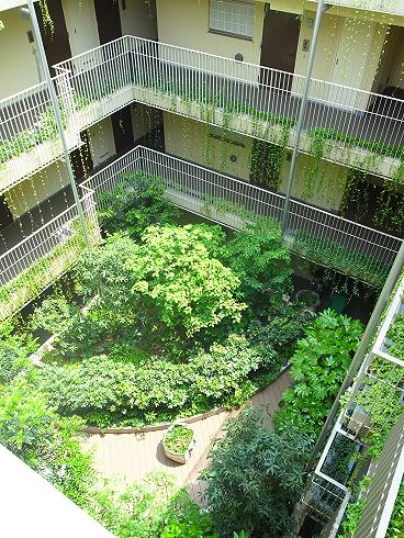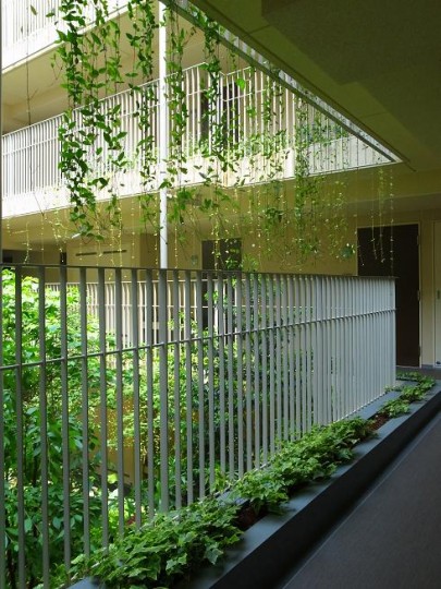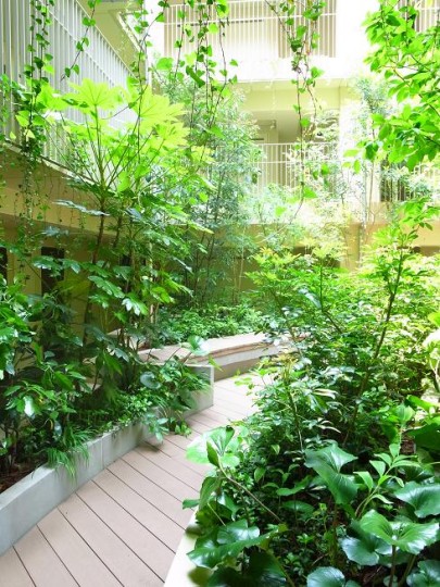 敷地周囲の十分な植栽および南北両面の壁面緑化、3階住宅階の中庭及び共用廊周囲の植栽ますの設置など、緑に囲まれた住環境の創出を心掛けた。