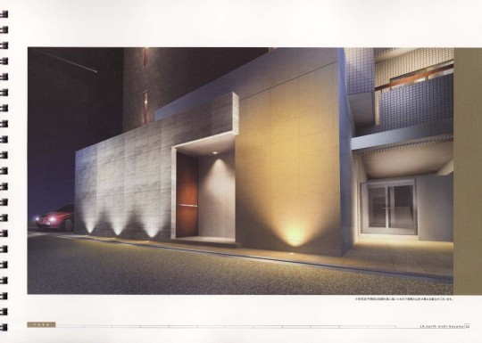 目黒区西小山の賃貸住宅のデザイン監修。建築の外観及びエントランス等共用部のデザインおよびモデルルームのコーディネート及び植栽計画。アースをテーマに使用される建材をセレクト。エントランスには店舗顔負けの樹脂系左官をシェードにした間接照明ウォールを作った。