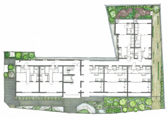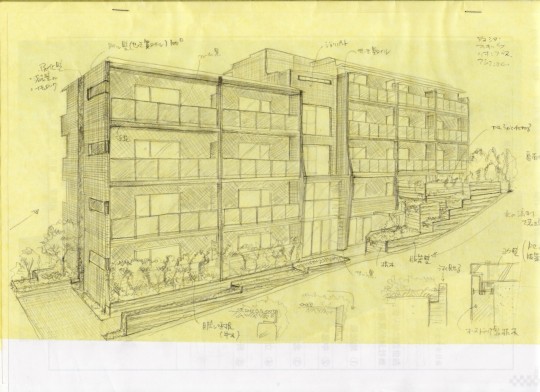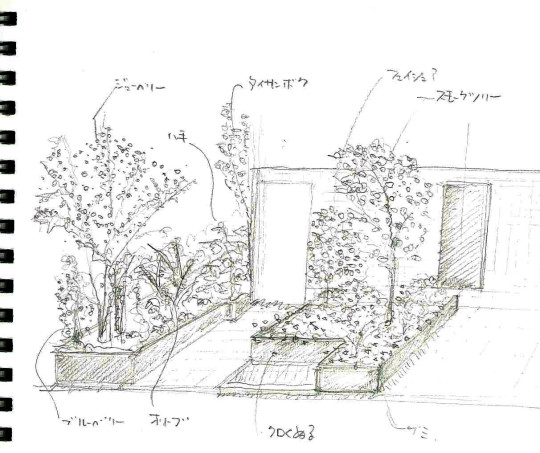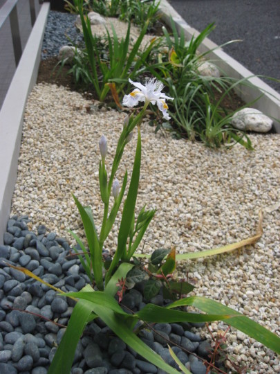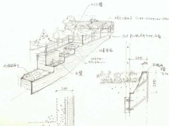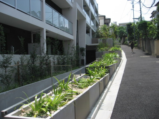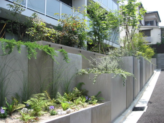 小石川植物園にほど近い白山の分譲マンションのランドスケープデザイン。施主は田園調布ガーデンフェアで大変お世話になった醍醐建設さん。敷地は大きな道路から少し入った落ち着いた路地に面した傾斜地。傾斜地の特性を生かし上から下へ水が流れるように、緑の流れが流れるような表現がしたいと考えました。それにより植え込まれる植栽マスはなるべく存在を消してほしく、且つ地下から隆起したようなデザインにしたいと考えました。そのため傾斜なりに立ち上がったコンクリート躯体の最終の見えがかり厚さを50mmに抑えてもらい、立ち上がりの壁面には型枠の厚み分ランダムにストライプのデザインとし3色のポーターズペイントで塗り分けを行いました。コンクリートウォッシュという塗料でモルタルやコンクリート面に含浸し、コンクリート面を活かしながら着色する塗料です。そのような基盤の上には上方より、落葉を主体としたモミジ、カエデ類を植え込んだマスから、コトネアスター、シダ類、シャガ、セキショウなど水の流れを喚起させる下草類と伊勢砂利を組み合わせ作庭を行いました。列植したトキワマンサクはアプローチを彩り早春に色めく妖艶なシャガの花が入居者を向かい入れます。南の庭にはウスバベニモモ、オリーブ、ブルーベリー、グミなど実物を多く植込み、小石川植物園から野鳥が飛来するような庭を作りました。