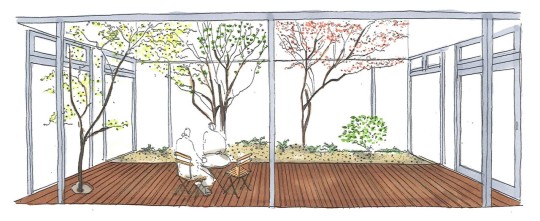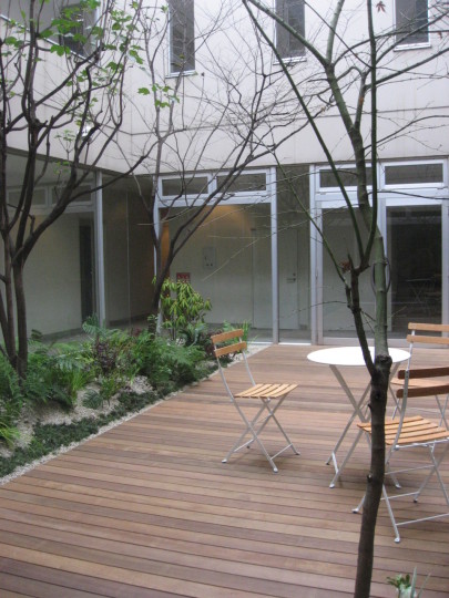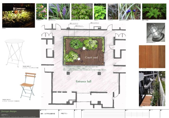 以前企業の社宅であった建物を女子学生会館にコンバージョンするプロジェクト。もともとあったうっそうとした中庭を学生会館のクオリティーに即した中庭に作り変えたいという希望からデッキ空間+植栽を見て楽しむ庭へ作り変えました。既存のノムラモミジやカクレミノは限られた日照条件のなかで華奢なイメージで枝ぶりを展開していたのでその良さはそのまま残し、整地をして既存の密生していたシダ類を整理し回廊から見て楽しめる庭を作りました。デッキにはコーヒーテーブルとデッキチェアを設え、エントランスからのシーンを演出しています。