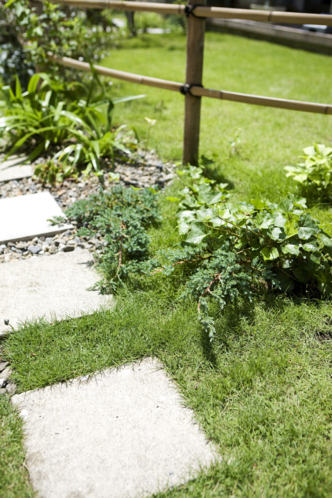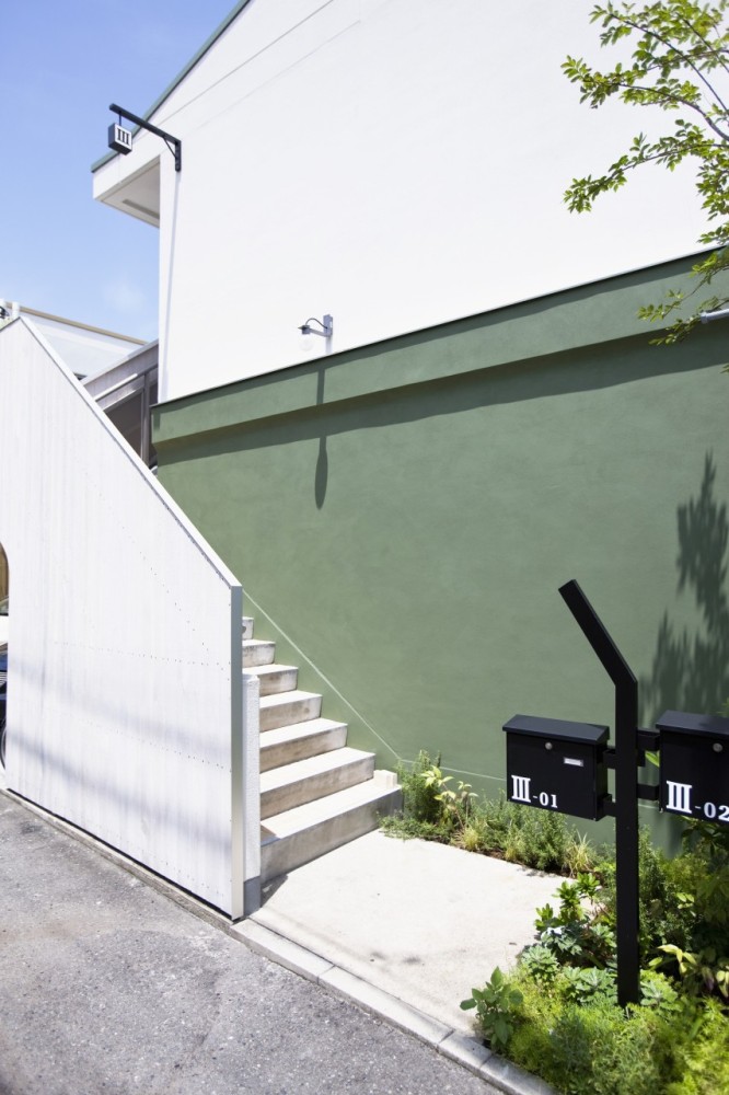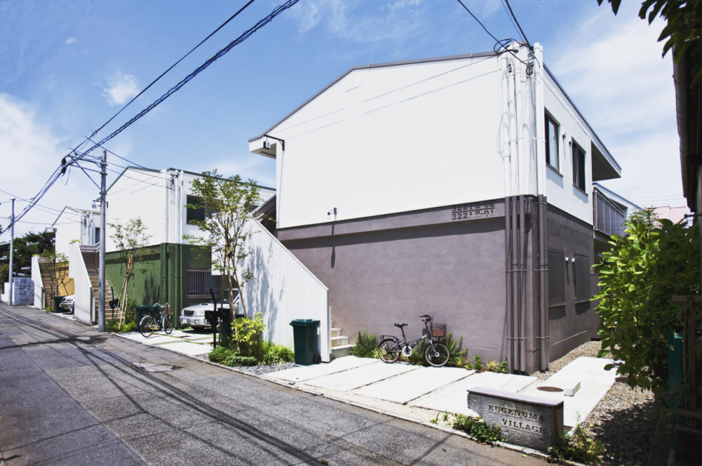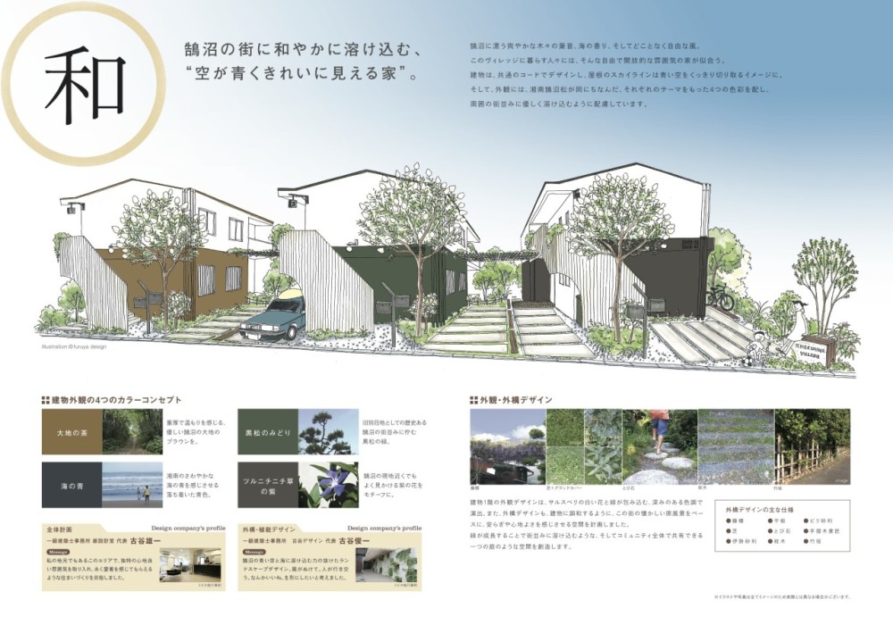 湘南の海にほど近い鵠沼松が丘という場所に建つテラスハウス(全4棟8戸)のリノベーショ ンプロジェクト。「街とつながる、人がつながる、垣 根のない暮らし」をコンセプトに外観デザイン及びランドスケープデザインを施しています。然るに道路と敷地の関係はフルオープンであり、誰でも入って来れる状態。これを危険とみる か気持ちのいい暮らしと考えるかは個々人の価値観に委ねるとして、後者の考え方を持つユー ザーに対して訴求力のある企画を作ろうということで、クライアントさん、コンサル会社さんとと もに形を組み立てていきました。 家の周りを子供たちが走り回れるように家の外周すべてに導線を用意することに重点 を置きました。よって、あらゆる箇所が路地空間としてこのビレッジの景色の一つとなるように考えました。大半の舗装を専有する車寄せスペースのたたきにはあえて隙間を作り芝生がランナーを走らせられるよう砂利と芝生をミックスして敷設しています。要所に植え込んだ耐性のある海辺の植物が花を添えます。建物の4つのキーカラーにはオーストラリア製のポーターズペイントを使用しそれぞれのカラーを特徴づける白い木壁が町並みにリズムを与えています。