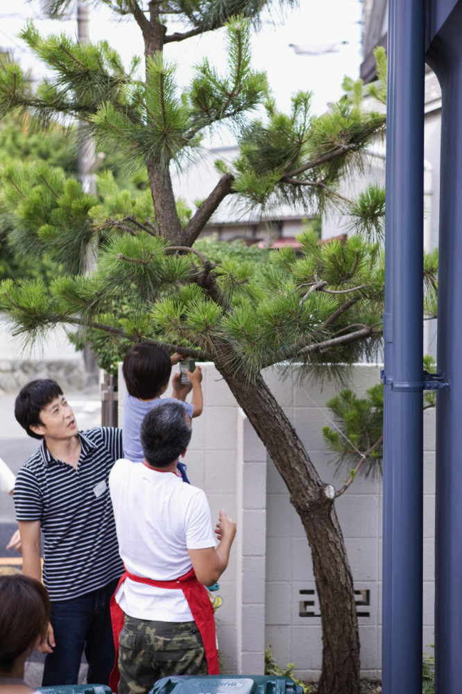 シンボルツリーには3連棟のリズム感を助長するよう、花付きの期間が長いサルスベリを植え 込みました。白花のサルスベリはどことなくあか抜けた雰囲気を回りに与えるので、このエリ アの松林の象徴的な町並みにとけ込みつつ街角を演出するのに一役買ってくれると思います。 それぞれのサルスベリに対に植え込んだシャクナゲが春先に大きく咲きほころび、追いかける ようにサルスベリの泡のような花が青い空にはえます。