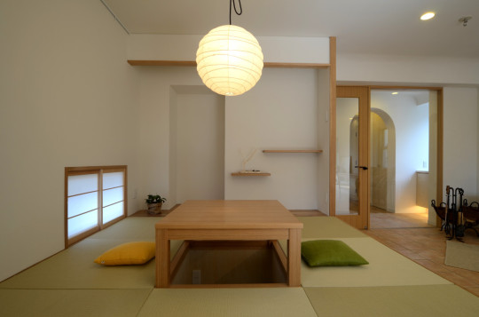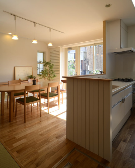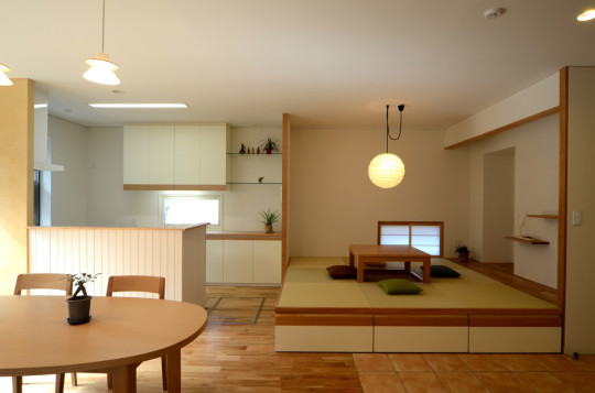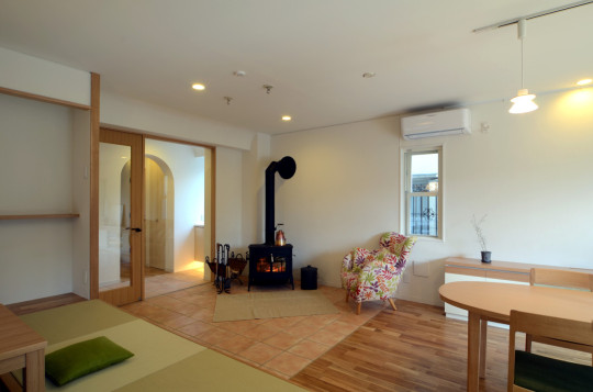 プロバンス風のインテリアVS和風のインテリアと嗜好が分かれていたご家族でしたが小上がりの畳スペースや暖炉空間、及びキッチンスペースが緩やかにつながるように木部をナラ材に統一やわらかな空間作りを目指しました。