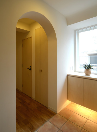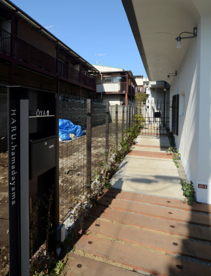 賃貸住宅としてマーケットの中でしっかり個性を表現すること。デザイナーズ物件にするのではなく、愛着を持って住んでもらえる、住宅の形を考えることが我々の使命でした。オーナーのご家族が考える住まいのイメージをできるだけデザインに取り込み、かつ長い間廃れない、飽きのこないデザインを志しました。プラン制約上発生していた軒下空間を楽しみの持てる空間に変換すべく躯体の入隅に大きくアールをとり、柔らかな陰影を軒下空間に取り込みわずかに軒ラインから外れている雨がかりのある部分に蔓植物を植え込みました。ツルマサキやテイカカヅラ、カロライナジャスミンなど日陰地でも元気に繁茂する植物をセレクトしています。建築の性能を重視するが故に生まれる納まりやあらゆる角をできるだけ廃し(あるいは見えないように)見た目に優しいカーブラインが主張するような外観作りを心がけました。