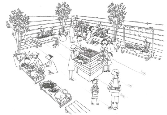 建物内にある共用のルーフテラスには菜園を楽しめるスペースや